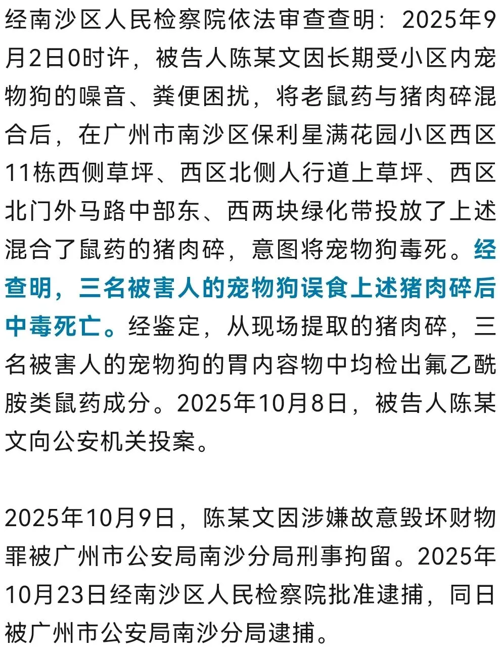 因长期受小区宠物狗的噪音、粪便困扰,1966年出生的男子在小区草坪、小区外绿化带投放老鼠药,导致三名被害人的宠物狗被毒死。男子被广州南沙区人民检察院以投放危险物质罪提起公诉。记者获悉,2月5日,该案在南沙区人民法院开庭审理。