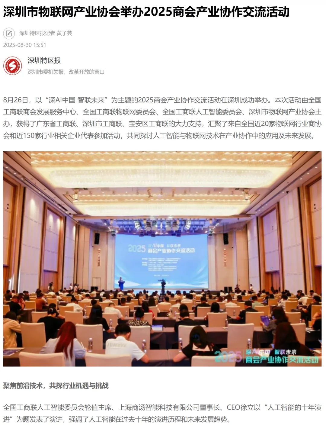 2025年8月26日,全国工商联商会发展服务中心联合深圳市物联网产业协会共同主办“深AI中国 智联未来”2025商会产业协作交流活动,全国工商联党组成员、副主席汪鸿雁,广东省工商联党组成员、专职副主席(主持工作)冯日光,深圳市委常委、统战部部长王强,市工商联党组书记刘俊琳,宝安区委常委、统战部部长卫树强,全联人工智能委员会轮值主席徐立,全联物联网委员会轮值主席巩书凯,中国信息通信研究院副院长魏亮等领导参加活动。