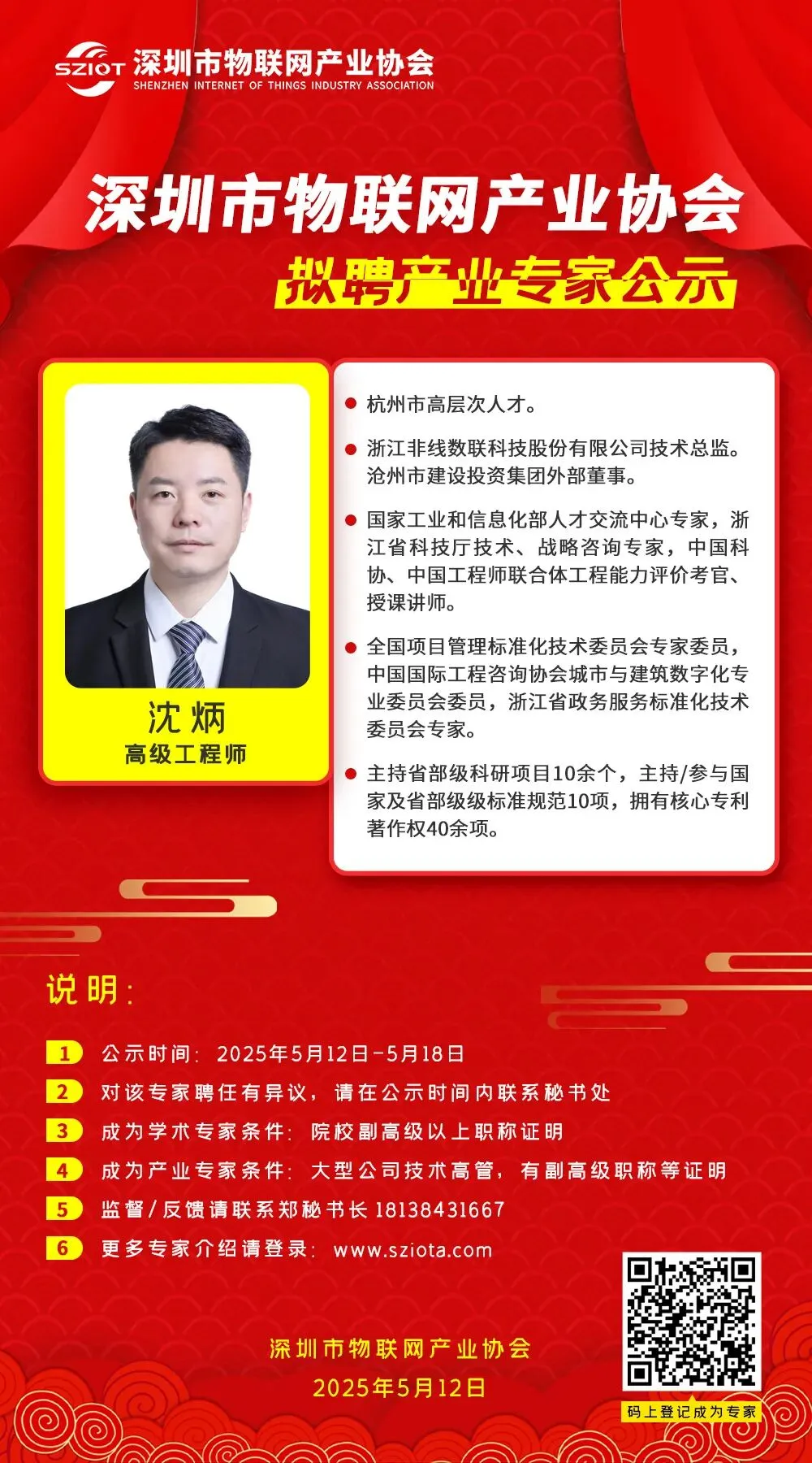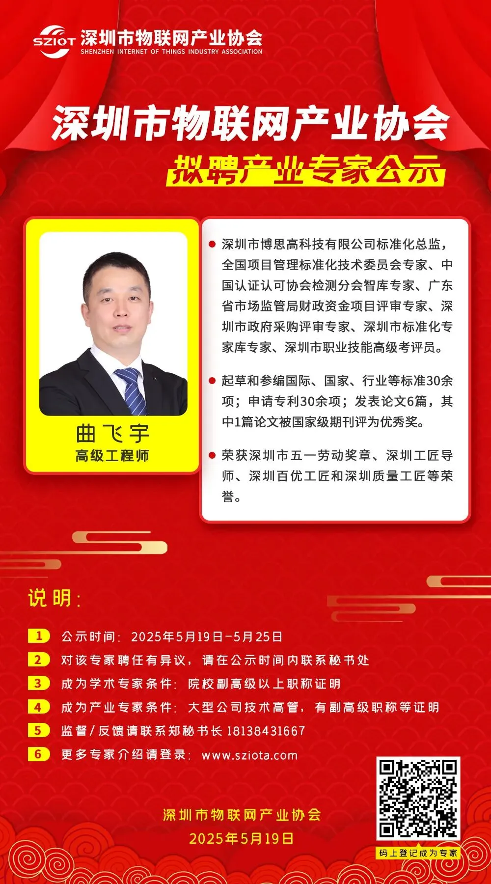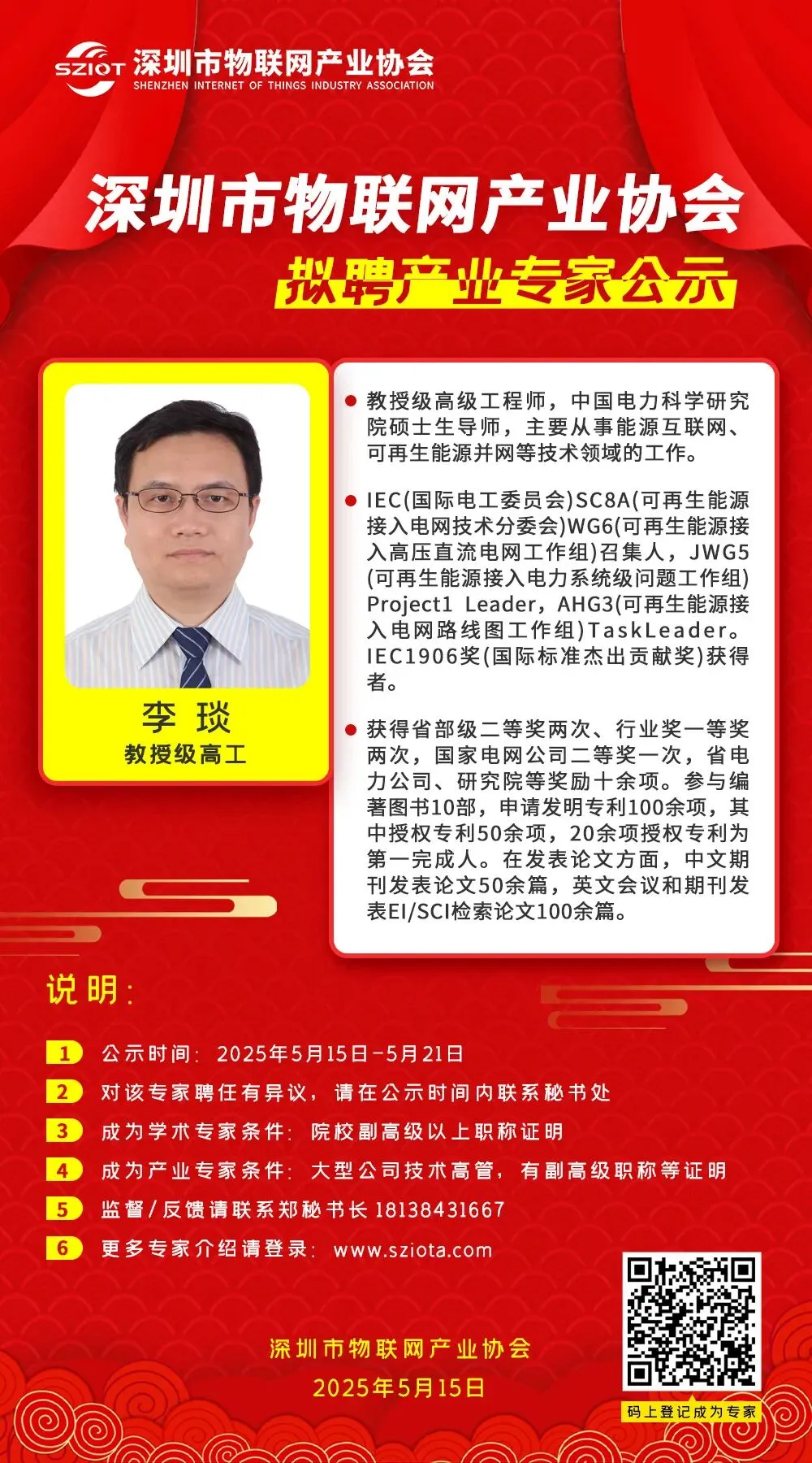 2025年,协会为进一步提升专业水平与行业影响力,特聘请深圳技术大学副教授宁磊为深圳市物联网产业协会学术专家,同时聘请浙江非线数联科技股份有限公司技术总监沈炳、国家级技能大师工作室领衔人,国务院特殊津贴专家俞天明、中国电力科学研究院硕士生导师李琰、深圳市博思高科技有限公司标准化总监曲飞宇,河南省物联网行业协会会长张涛,深圳市信维通信股份有限公司中央研究院副院长王钦为深圳市物联网产业协会产业专家。