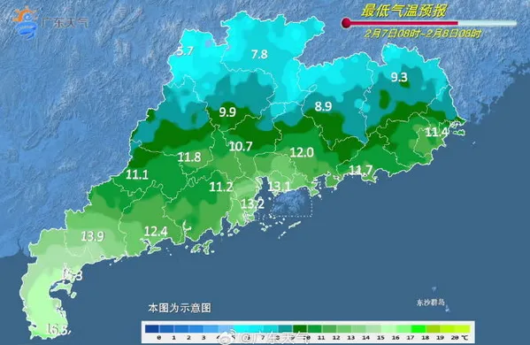 - 7日,广东大部多云,有分散小雨。气温继续下降,最低气温:粤北市县7℃~11℃(高海拔山区3℃~5℃),南部沿海市县16℃~20℃,其余市县12℃~14℃。