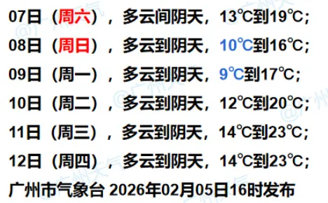 据先前报道,2026年春运期间广东省气温接近历史同期略高,降水偏少,主要有5次冷空气过程。本次冷空气过程体感阴冷,大家要注意防御大风和降温。广州未来几天天气预报