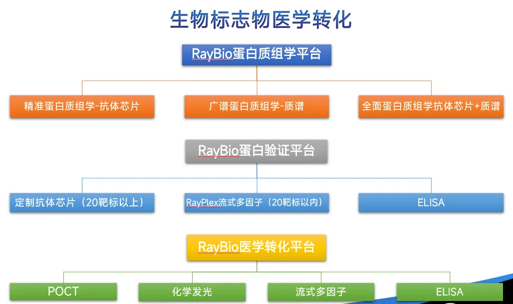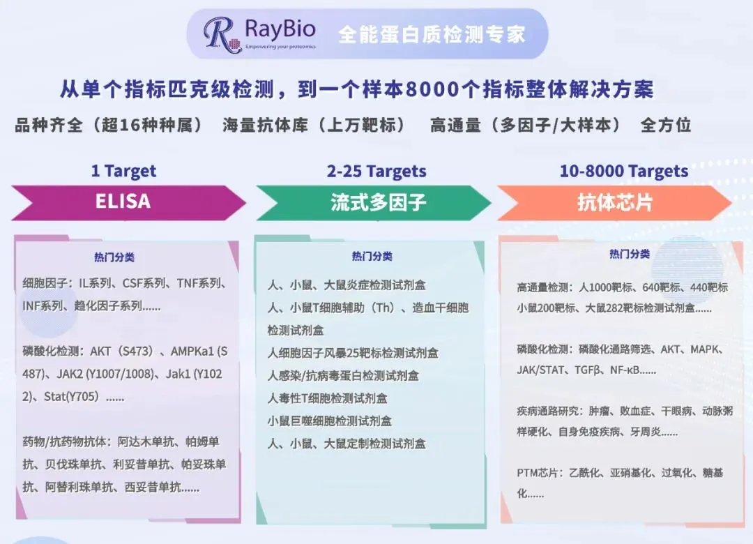 RayBiotech是一家以国际领先的蛋白检测技术和产品为主导、集科学研究,技术和产品开发,生产和销售,以及人才培养和教育的国家高新科技企业。特有的蛋白芯片技术及蛋白组研究平台帮助全世界各大科研机构,制药公司和诊断试剂公司的科学家找到了采用传统方法无法找到的新生物标记物,同时,公司以蛋白芯片这一核心技术为基础,构建了从上游的生物原材料研发到下游的产品研发,再到平行的酶免技术、化学发光技术、时间分辨荧光技术、胶体金技术研发平台,为生命科学研究提供从发现到医学转化的全方位技术平台。