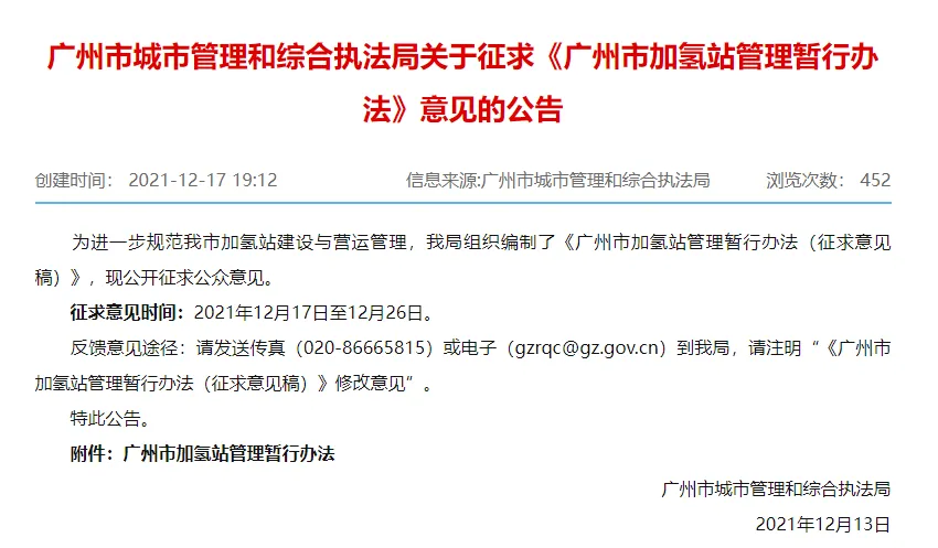 近日,广州市城市管理和综合执法局就《广州市加氢站管理暂行办法》(以下简称《暂行办法》)公开征求意见。