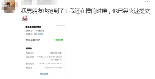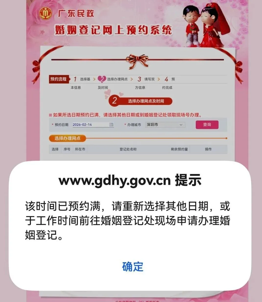 截至目前,2月14日当天,深圳各区婚姻登记处线上名额已全部约满。