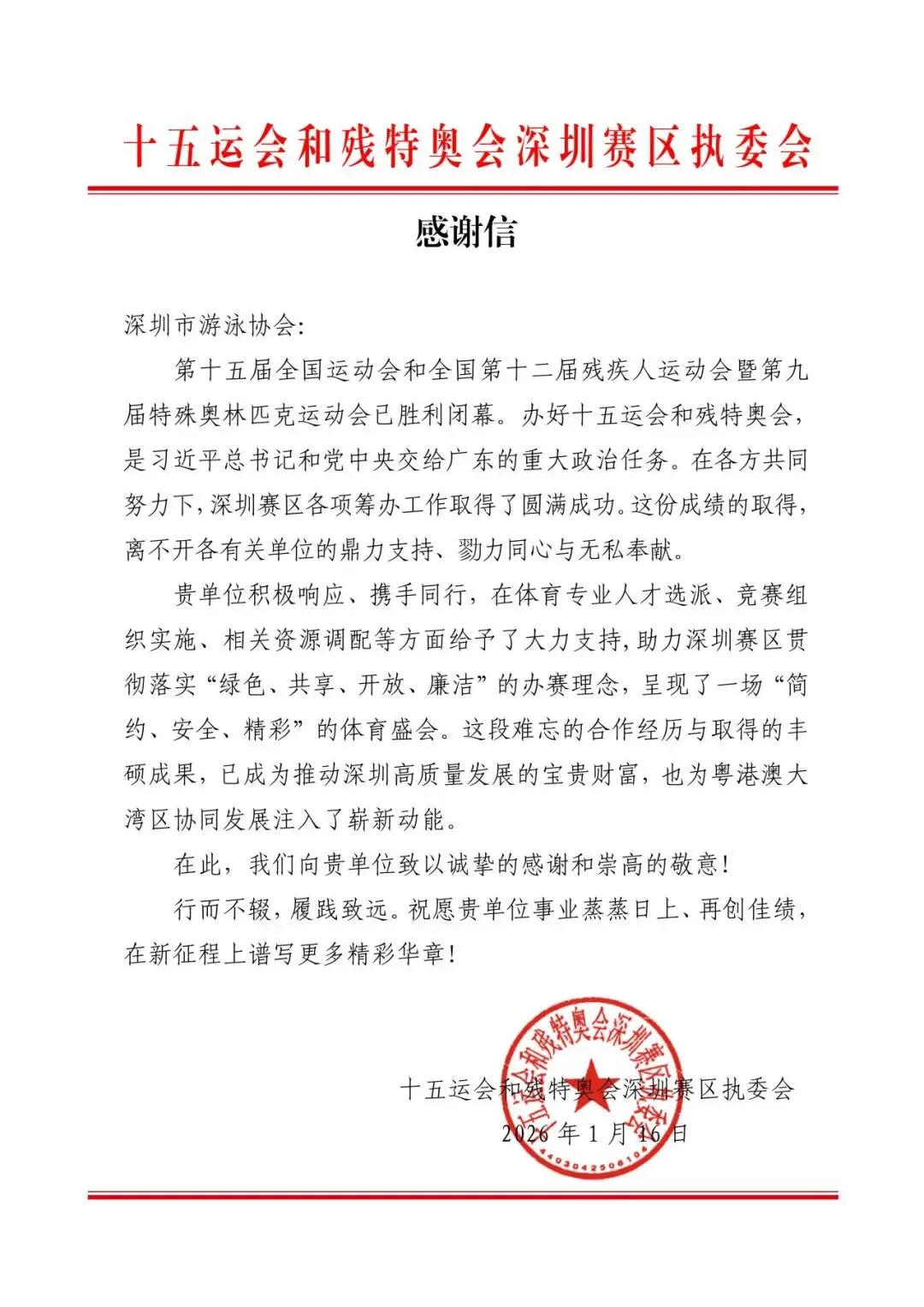 近日,深圳市游泳协会收到来自“十五运会和残特奥会深圳赛区执委会”的感谢信,对泳协在赛事期间的专业支持与无私奉献致以诚挚谢意。在第十五届全国运动会及全国第十二届残疾人运动会暨第九届特殊奥林匹克运动会中,深圳泳协积极响应、全力配合,在人才选派、竞赛组织等方面发挥了重要作用,助力深圳赛区呈现了一场“简约、安全、精彩”的体育盛会。