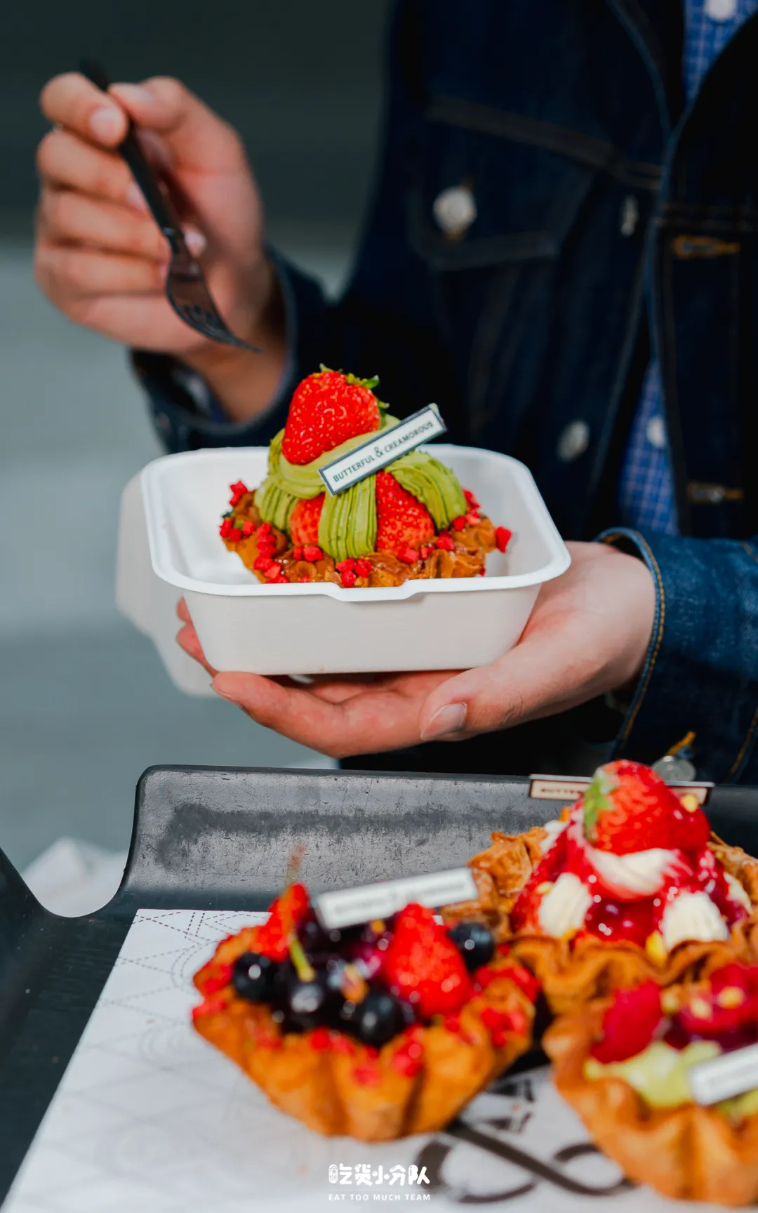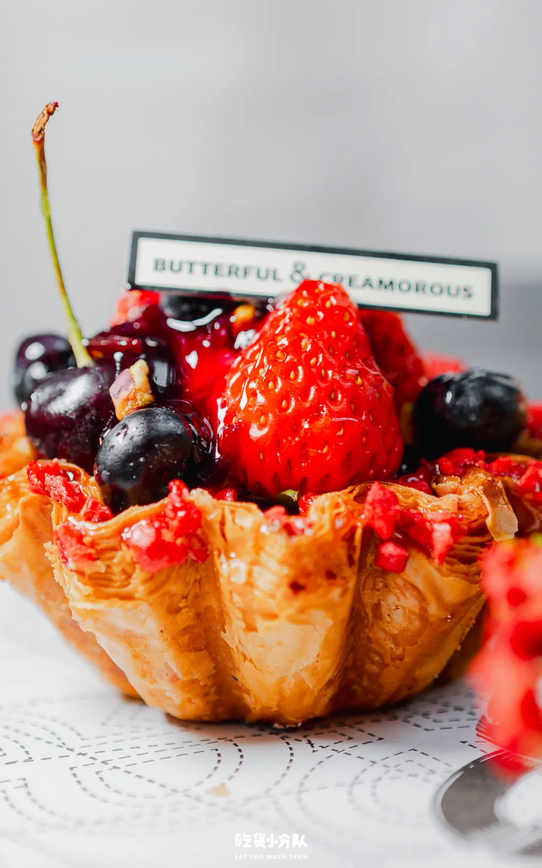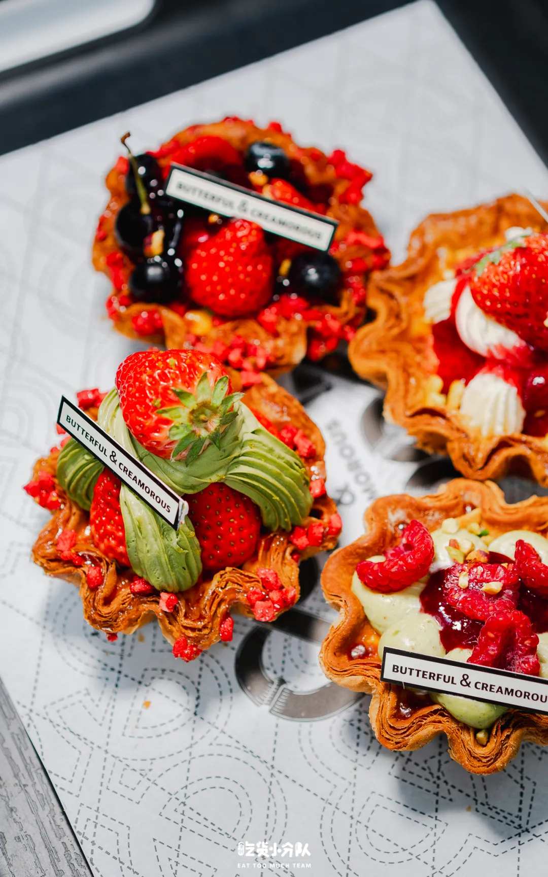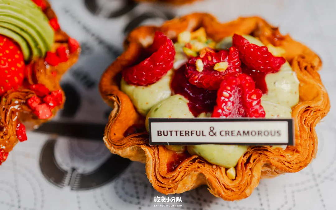 我们买了当天店里出品的3款:“抹茶奶油草莓蛋挞”这款是“身高最高”的,草莓和和抹茶奶油非常适配,“开心果树莓奶油蛋挞”能吃到浓郁的开心果酱的味道,搭配树莓也是官配CP了,还有一款“多重莓果奶油蛋挞”这款颜值非常高,水果也堆得很多,主要的风味吃车厘子酱,吃起来酸甜解腻。