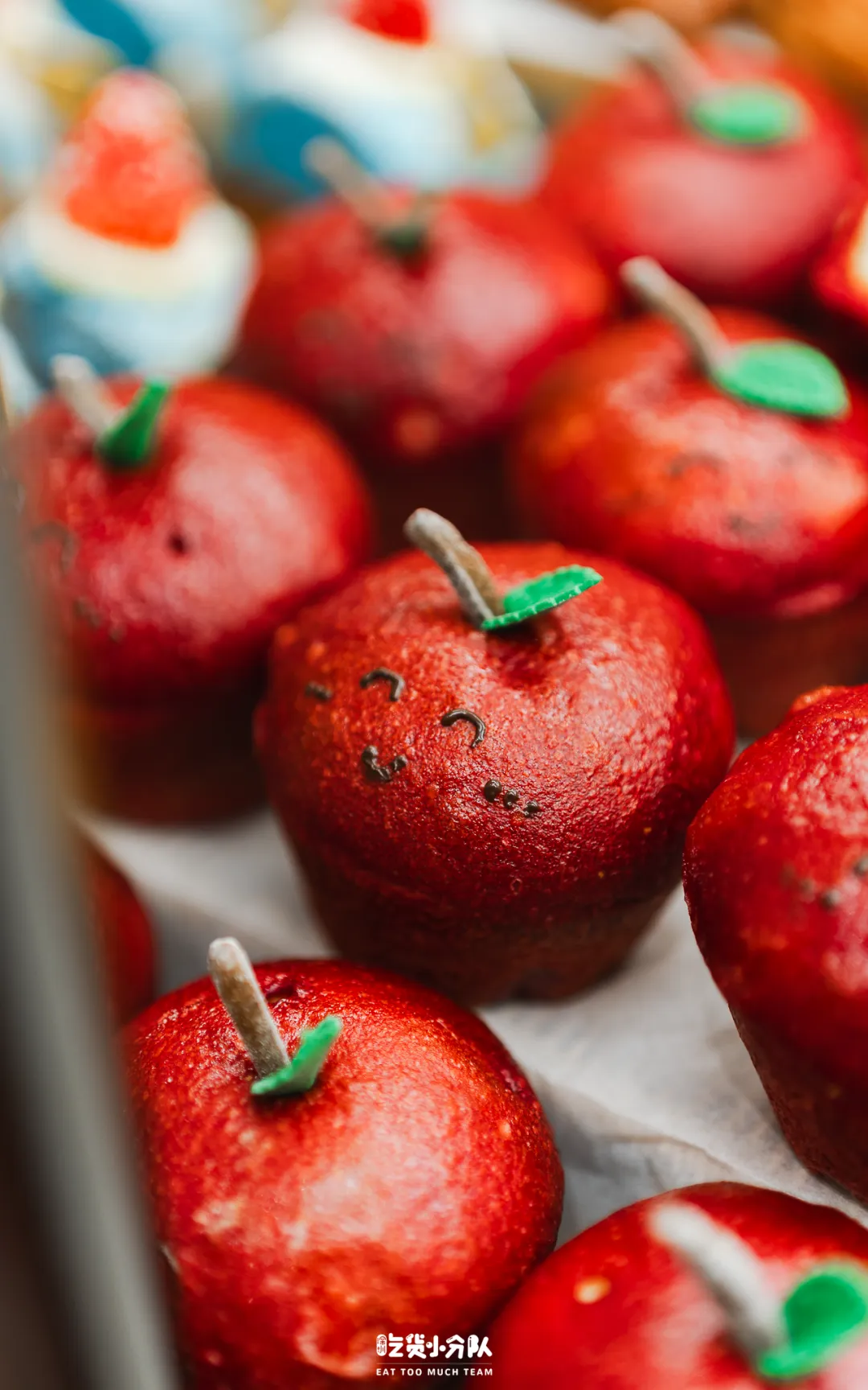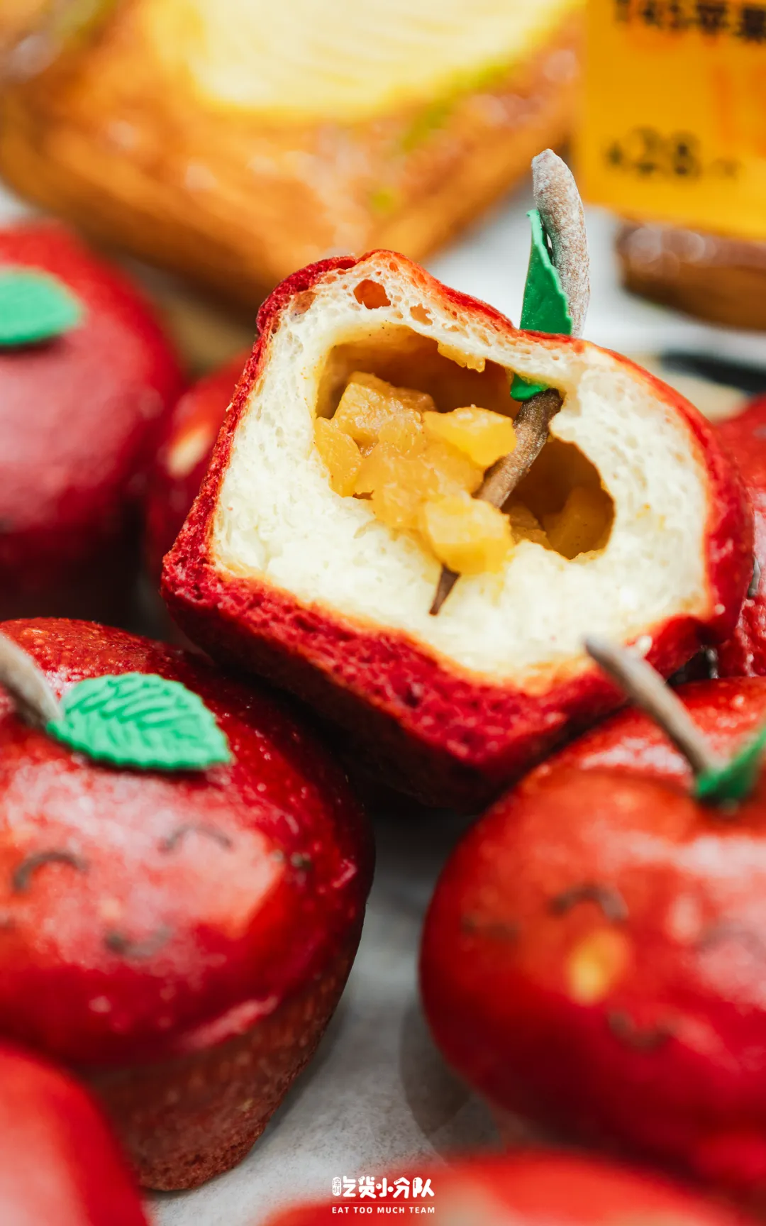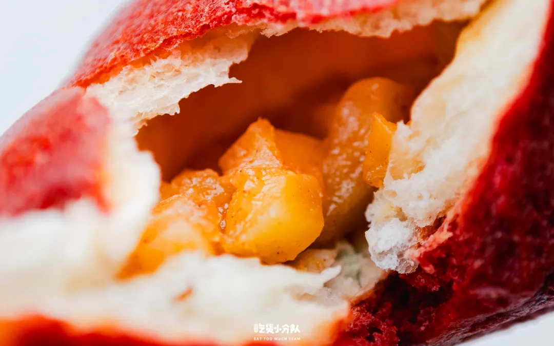 Paper stone的新年单品,全部摆在展示柜,这款红彤彤的苹果,很难不注意到。看起来是一颗苹果,其实是加了红菜头汁和面的面包,外皮韧劲十足,咬开真能吃到苹果,内馅是肉桂苹果丁,香气非常浓郁。(首图的灯笼蛋糕也是他家的,感兴趣的朋友可以买来尝尝)