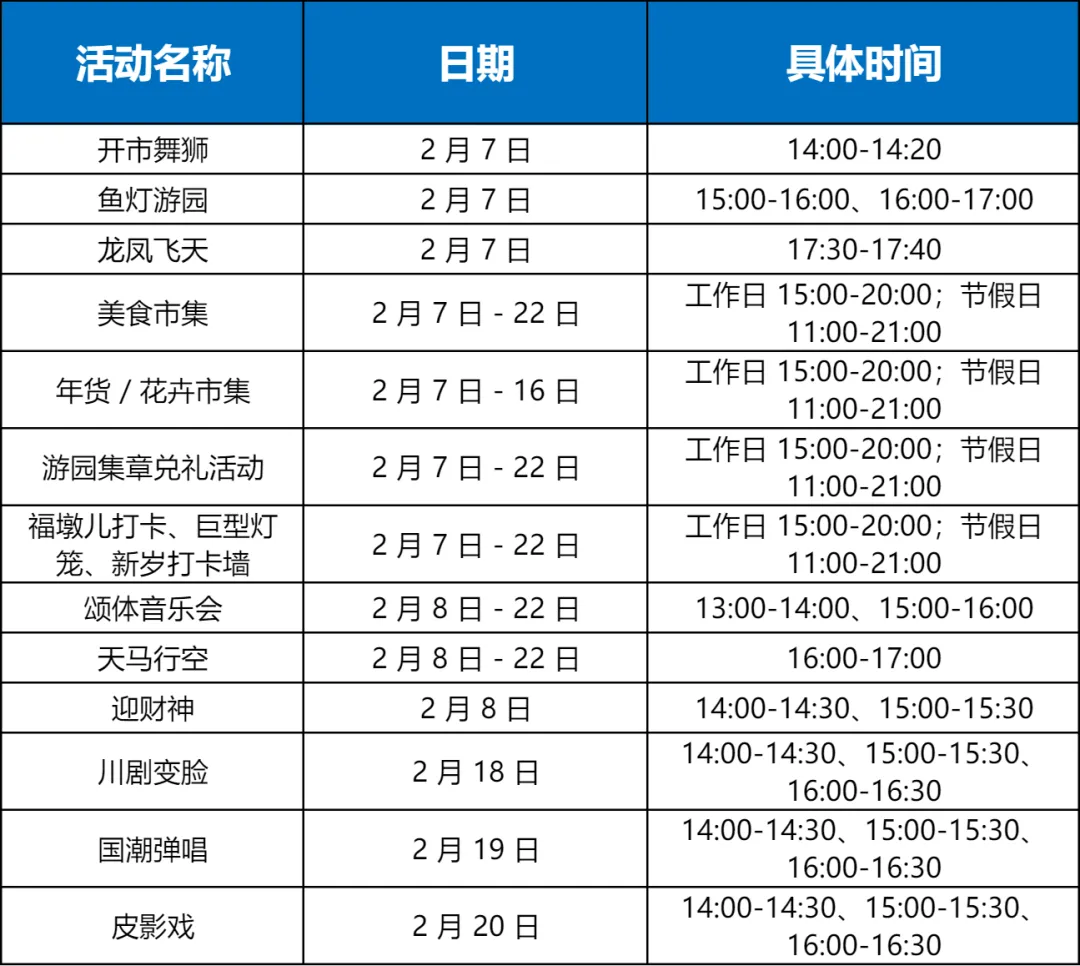 ✨亮点:美食 / 花卉市集、鱼灯游园、巨型灯笼、新年打卡墙、音乐会、游园集章、龙凤飞天、开市舞狮等