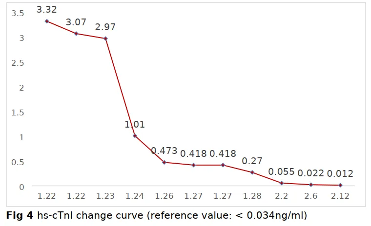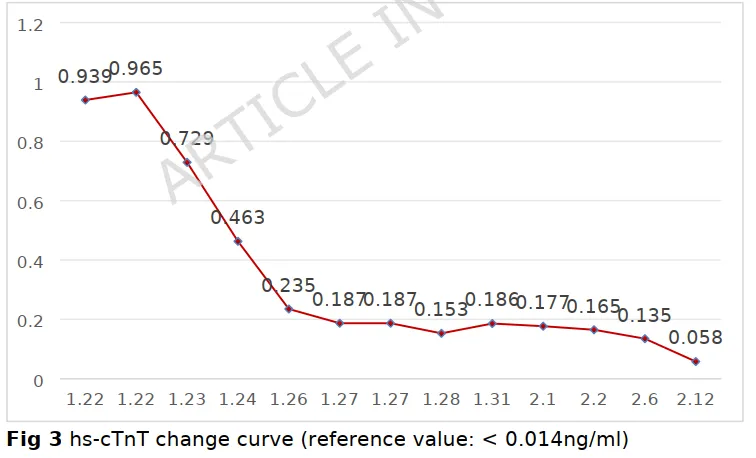 图注说明:左图为高敏肌钙蛋白T(hs-cTnT)变化曲线,参考值<0.014 ng/mL。患者入院时hs-cTnT高达0.939 ng/mL,随后在VA-ECMO联合IABP支持及免疫调节治疗下逐步下降,至1月28日已接近正常范围,提示心肌损伤逐步修复。右图为高敏肌钙蛋白I(hs-cTnI)变化曲线,参考值<0.034 ng/mL。其动态趋势与cTnT基本一致,进一步印证了心肌坏死标志物的回落与临床病情改善同步。这两条曲线不仅是诊断爆发性心肌炎的关键依据,更是评估治疗反应、指导撤机时机的重要参考。