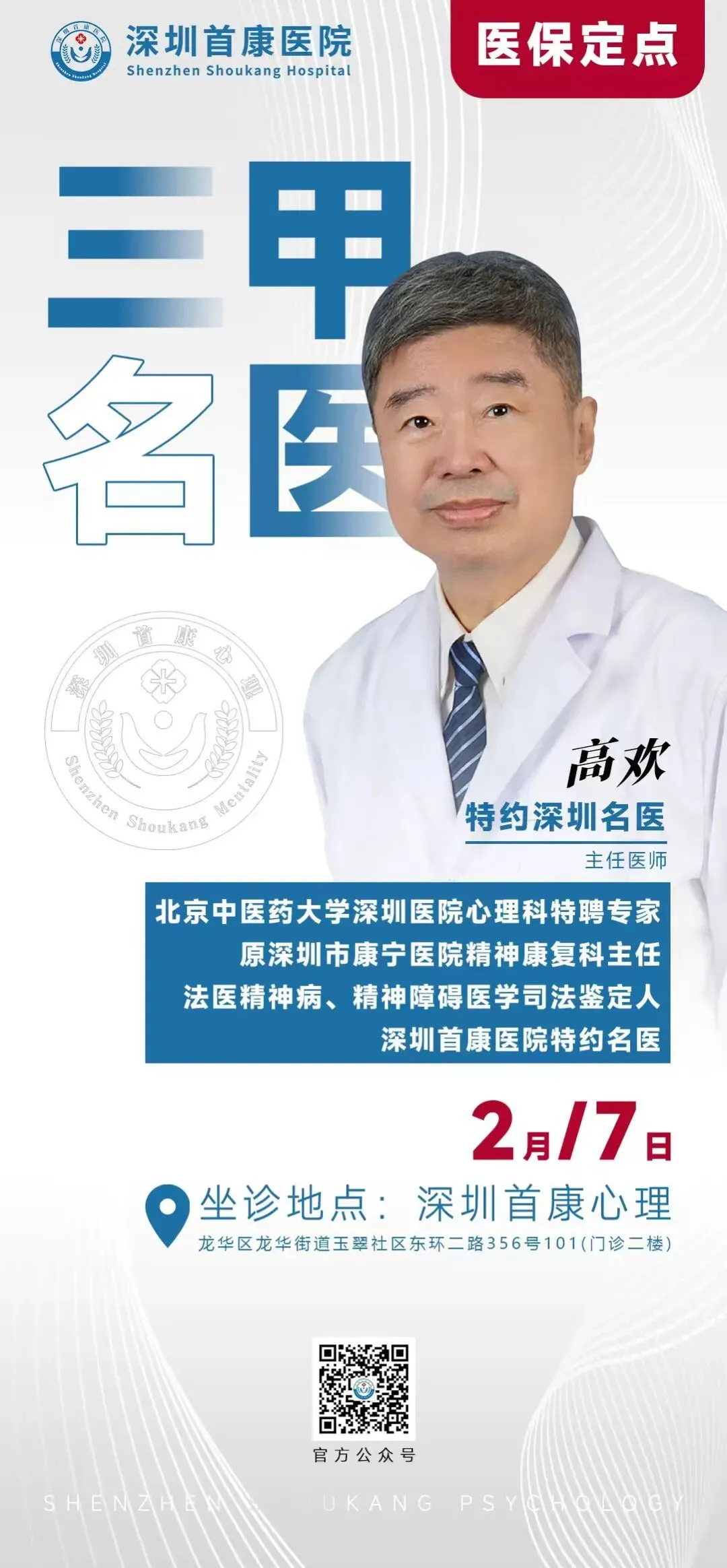 深圳首康心理科02月07日北京中医药大学深圳医院心理科特聘专家王桂芳主任与北京中医药大学医院心理科特聘专家高欢主任出诊