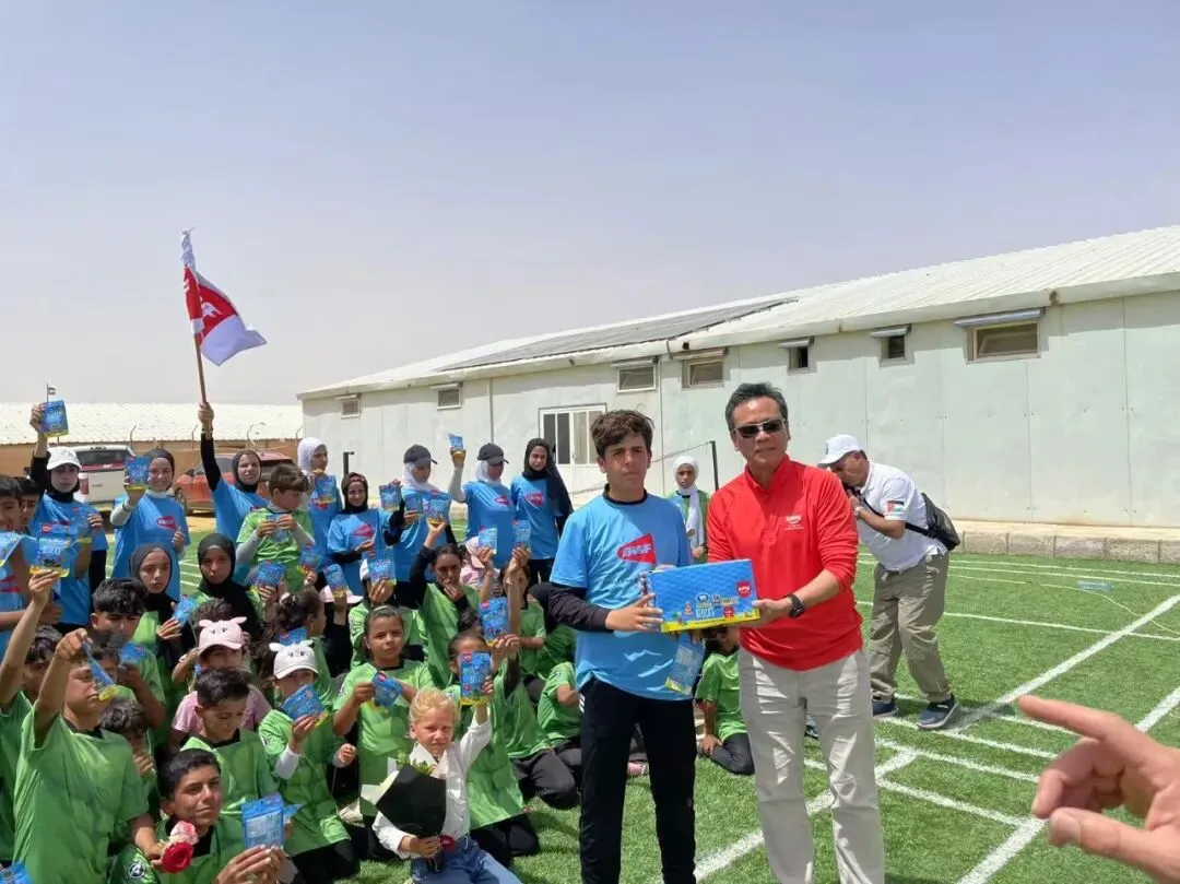 (金多多食品集团董事长马恩多向约旦难民营捐赠Amos阿麦斯4D积木软糖)