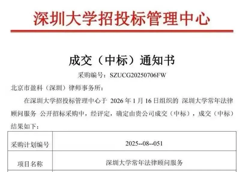深圳大学常年法律顾问服务中标(成交)结果公告