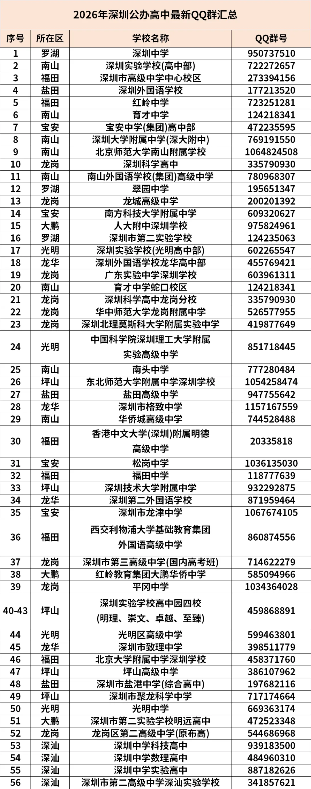 >最新!深圳56所公办高中26年中考招生QQ群!