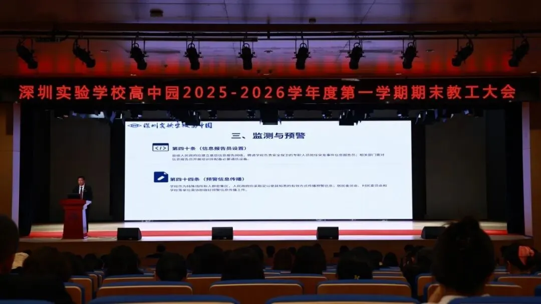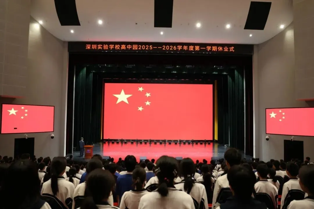 休业式在庄严的国歌声中启幕。全体与会师生共同观看了园区联合党委副书记、总校长李震宇的学期总结视频。视频系统回顾了本学期深实高中园在“融合办学、五阶育人”理念指引下取得的各项突破与发展。一学期来,深实高中园在湾区教育的热土上深耕不辍,实验学子全面发展,展现了“青春实验”昂扬奋进的精神风貌,在学业、科创、艺体、实践等各方面屡结硕果,彰显了深圳实验教育品牌的时代张力。