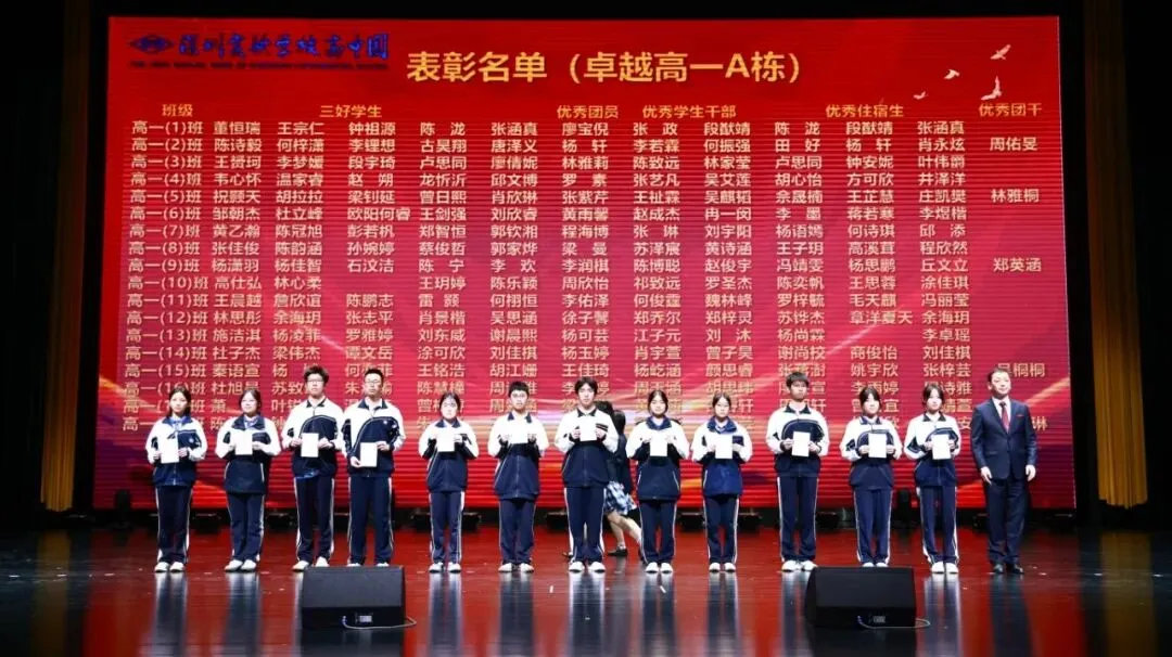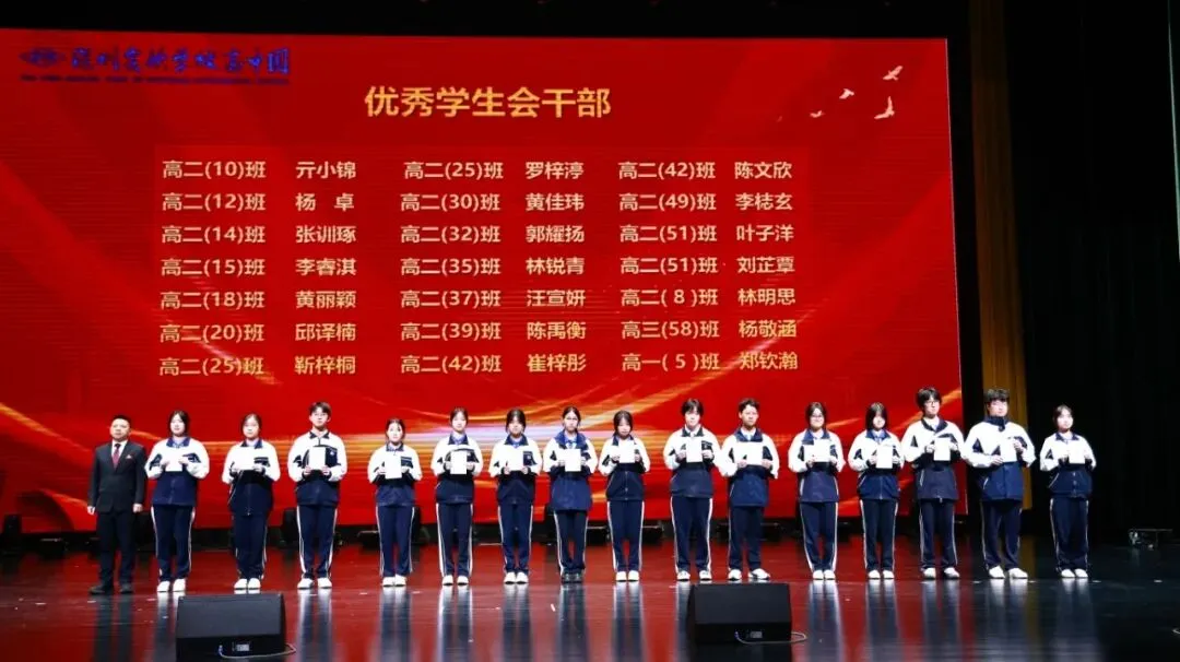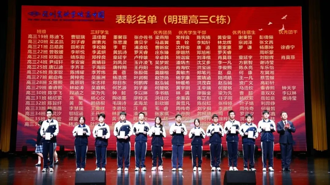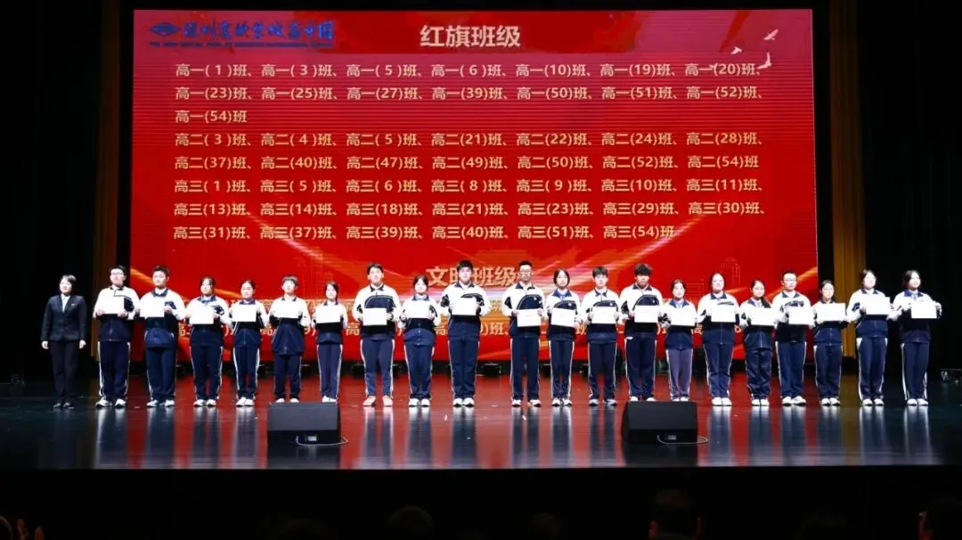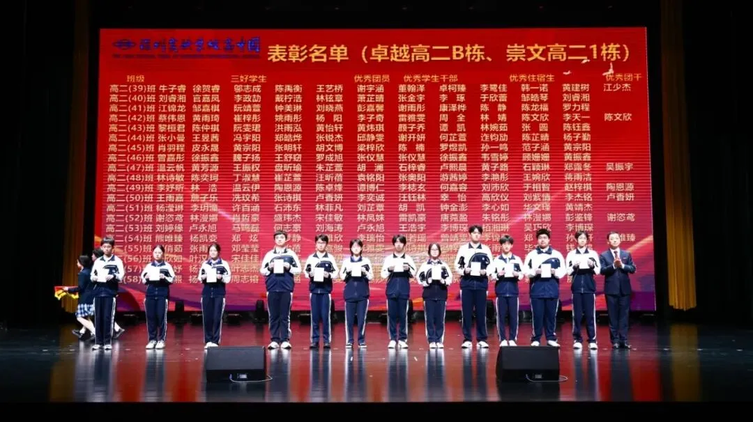 深圳实验学校崇文高中副校长李刚宣读了本学期红旗班、三好学生、优秀学生干部、优秀住宿生、优秀团员、优秀团干、 优秀学生会干部等表彰决定。