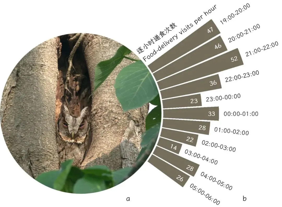 a: Collared Scops Owl perched at the nest cavity entrance (Photo by Canzhong Rong); b: Distribution of food-delivery visits of Collared Scops Owls during the nestling period per hour.