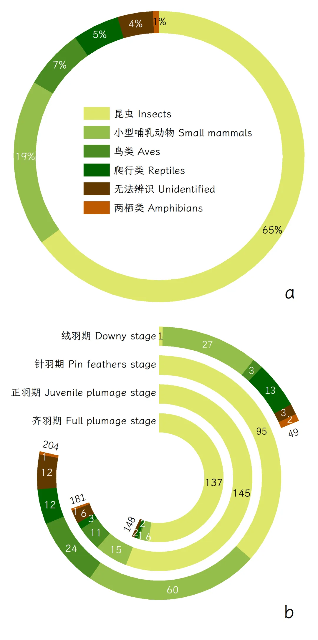a:领角鸮育雏期整体食物种类和比例;b:领角鸮雏鸟不同阶段的递食次数与种类。