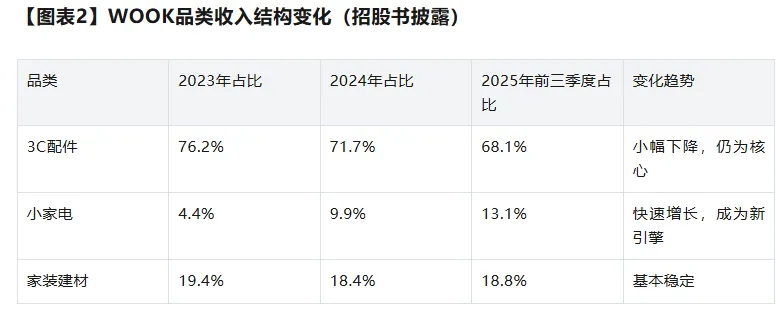 # 产品结构上,公司逐步降低单一品类依赖,小家电业务两年多收入增长近3倍,2024年3C配件贡献71.7%的核心收入,家装建材占比达10.7%,形成多品类协同发展的良好态势。