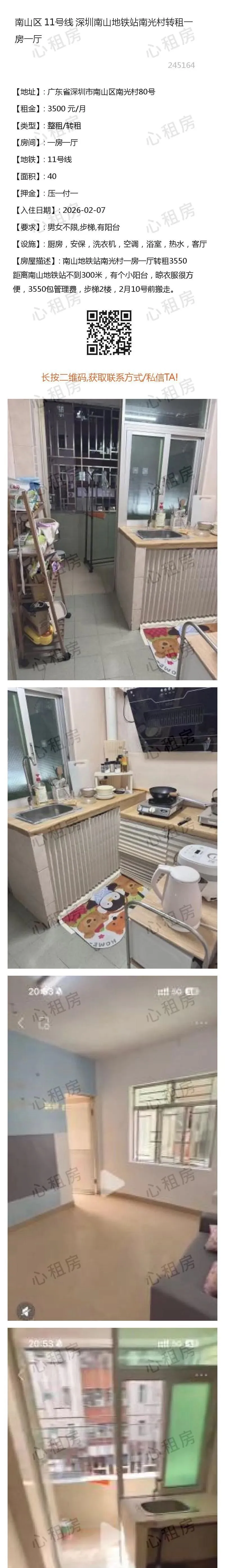 深圳租房【南山4则】房源①:11号线深圳南山地铁站南光村转租一房一厅3500元/月;房源②:…