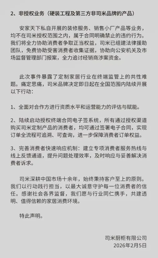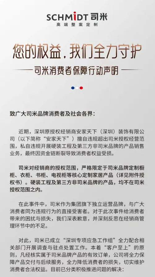 声明指出,此次事件源于深圳原授权经销商“安家天下(深圳)装饰有限公司”擅自违规超出授权经营范围,私自开展硬装工程及销售第三方非司米品牌产品,最终因自身资金链断裂导致消费者权益受损。