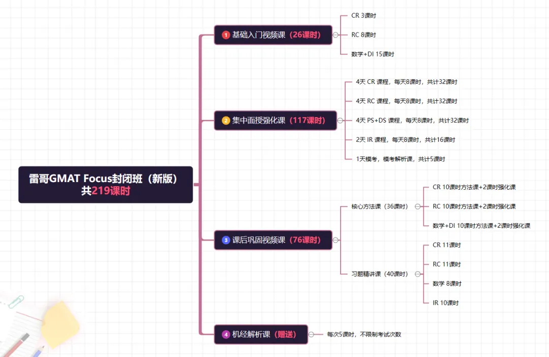 如何才能帮助大家在集中时间段高效学习和提分呢?科学的备考逻辑也是很重要的,雷哥GMAT多年课程培训经验,多次迭代优化了以下GMAT课程封闭班集训流程!