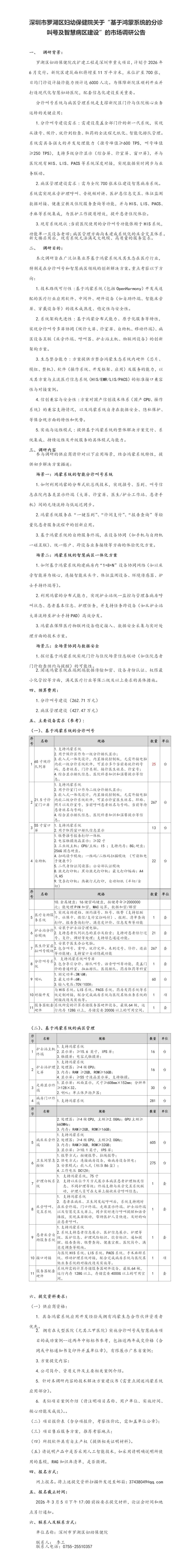 深圳市罗湖区妇幼保健院关于“基于鸿蒙系统的分诊叫号及智慧病区建设”的市场调研公告