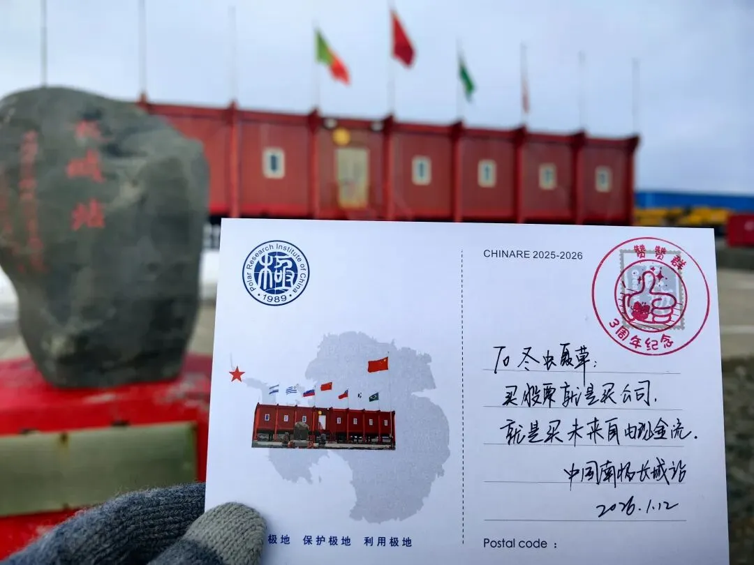 感谢杰哥和欢欢一起为每位赞友准备了明信片,盖上了南极长城站的印章,并带着卡片在长城站前拍照。这份跨越地球两端的祝福,太珍贵了。