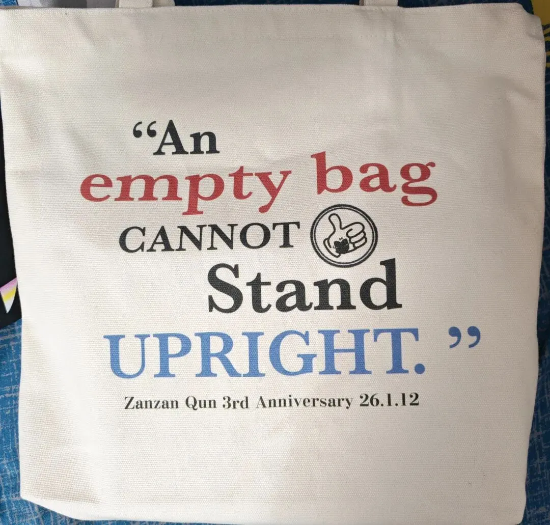 我还特意查了查这段英文,它的意思是空麻袋站不直。很好地提醒了我们要做一个内心丰盈的人,不但要有知识,更要有感情,这样我们的生活才能更加的美好。背面印在字母“Z”中的“PRAISE EACH OTHER, RISE TOGETHER”(互相赞美,共同成长),精准传达了社群“鼓励、陪伴、共同进步”的核心价值观。太用心了,优秀。
