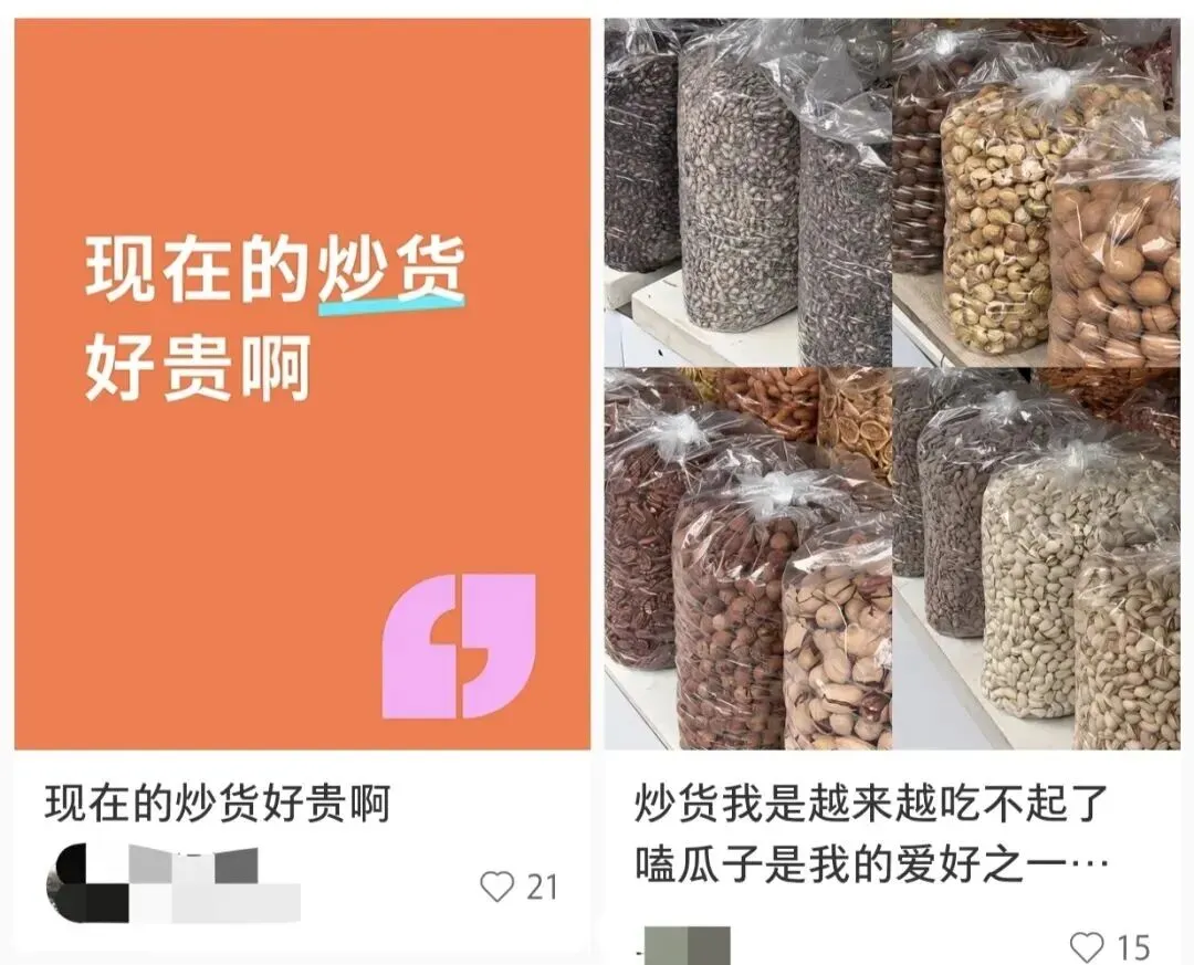在社交媒体上,不少网友也吐槽起炒货价格猛涨“越来越吃不起了”,“炒货已经比炒股还可怕了”。