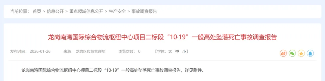 2025年10月19日15时50分许,深圳市龙岗区某物流枢纽中心项目二标段7号仓发生一起一般高处坠落事故,造成1人死亡,直接经济损失198万元。