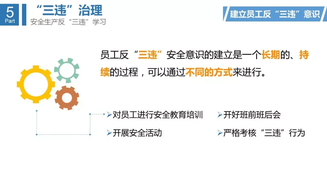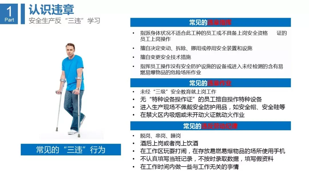 “三违”是指“违章指挥、违规作业和违反劳动纪律”的简称。违章指挥:主要是指生产经营单位的生产经营管理人员违反安全生产方针、政策、法律、条例、规程、制度和有关规定指挥生产的行为。违章指挥具体包括:生产经营管理人员不遵守安全生产规程、制度和安全技术措施或擅自变更安全工艺和操作程序,指挥者使用未经安全培训的劳动者或无专门资质认证的人员;生产经营管理人员指挥工人在安全防护设施或设备有缺陷、隐患未解决的条件下冒险作业;生产经营管理人员发现违章不制止等。违章作业:主要是指工人违反劳动生产岗位的安全规章和制度(如安全生产责任制、安全操作规程、工作交接制度等)的作业行为。违章作业具体包括:不正确使用个人劳动保护用品、不遵守工作场所的安全操作规程和不执行安全生产指令。违反劳动纪律:主要是指工人违反生产经营单位的劳动纪律的行为。违反劳动纪律具体包括:不履行劳动合同及违约承担的责任,不遵守考勤与休假纪律、生产与工作纪律、奖惩制度及其他纪律等。