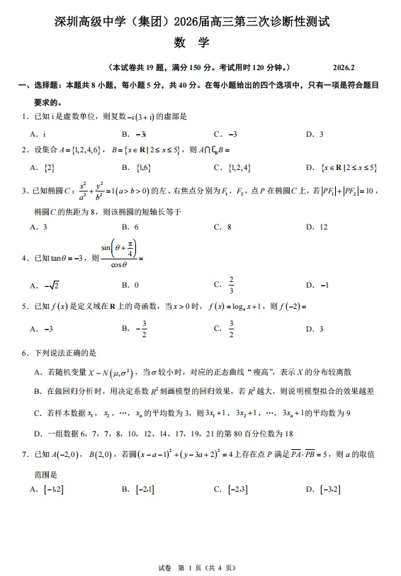 20260206深圳市高级中学2026届高三第三次诊断考试数学试卷+答案+点评
