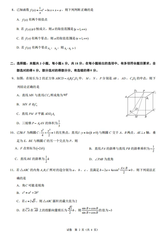 第8题:考点为利用导数研究函数的性质,包括极值、零点、恒成立问题。解题思路需对 f(x)求导分析其单调性与极值点,通过函数图像特征(或分离参数)判断选项。亮点是综合考查导数在研究函数性质中的核心应用,涉及分类讨论、数形结合等高阶数学思想,是典型的函数与导数综合难题。