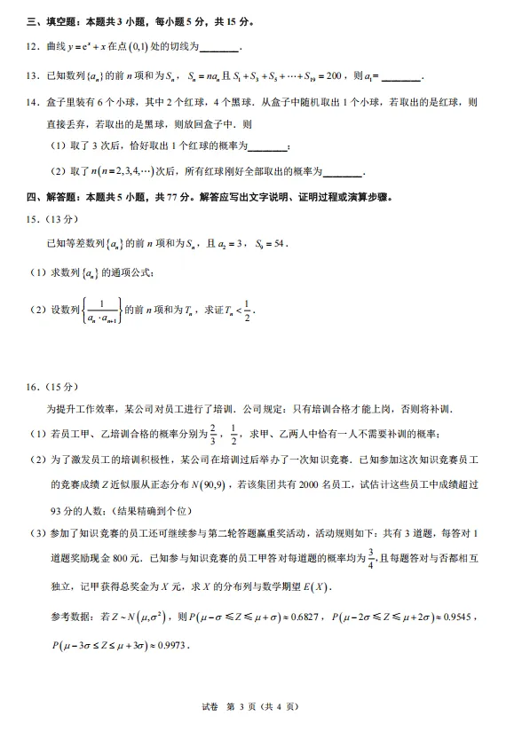 第16题:考点为概率与统计的综合应用,包括独立事件的概率、正态分布、二项分布及数学期望。解题思路(1)计算互斥事件的概率和;(2)利用正态分布的对称性估算概率和人数;(3)确定随机变量X的取值,计算对应概率,列出分布列并求期望。亮点是将现实情境(员工培训、竞赛)与概率统计核心知识结合,考查数学建模和数据推断能力。