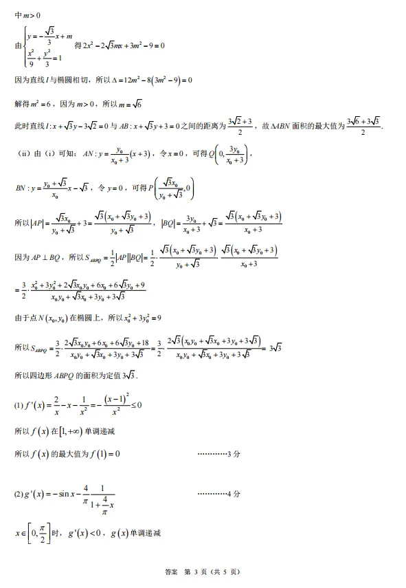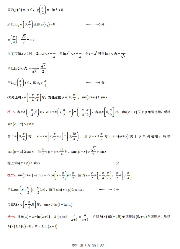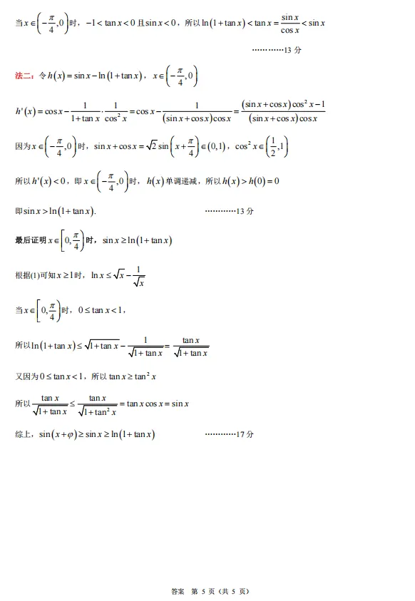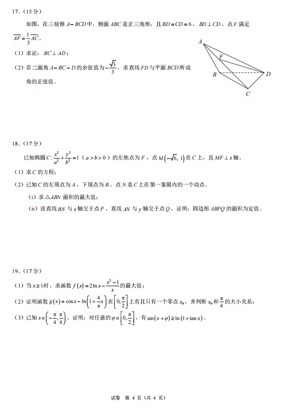 第19题:考点为函数与导数的综合应用,包括函数最值、零点存在性、不等式证明。解题思路(1)求导判断单调性得最值;(2)求导判断单调性,结合零点存在定理证明零点唯一,并利用(1)的结论或常用不等式比较大小;(3)通过放缩,将不等式分解为 sin(x+φ)≥sinx和 sinx≥ln(1+tanx)两部分分别证明。亮点是本题为压轴题,难度大,综合性强,涉及多次求导、放缩技巧、分类讨论以及将复杂问题拆解的解题策略,全面考查数学素养和思维能力。