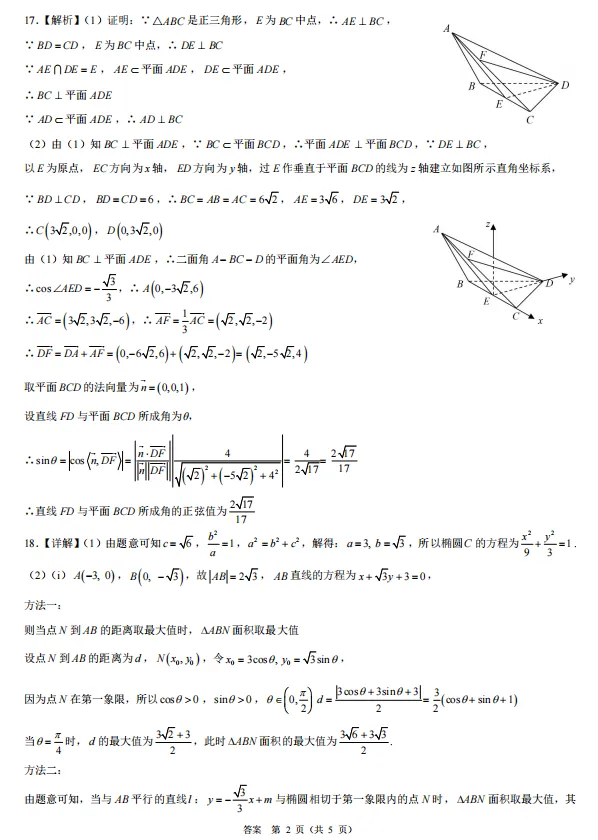 第17题:考点为立体几何中线面垂直的证明、二面角、线面角的计算。综合考查空间几何的定理证明与空间向量法求角,对空间想象和计算能力要求较高。