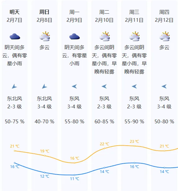 2月7日—9日受冷空气影响,转阴天到多云,局部有零星小雨,气温逐日下降,2月7日16℃—21℃,白天北风逐渐加大,2月8日—9日早晚体感较冷,最低气温降至11℃,昼夜温差减小,最大阵风7级左右。