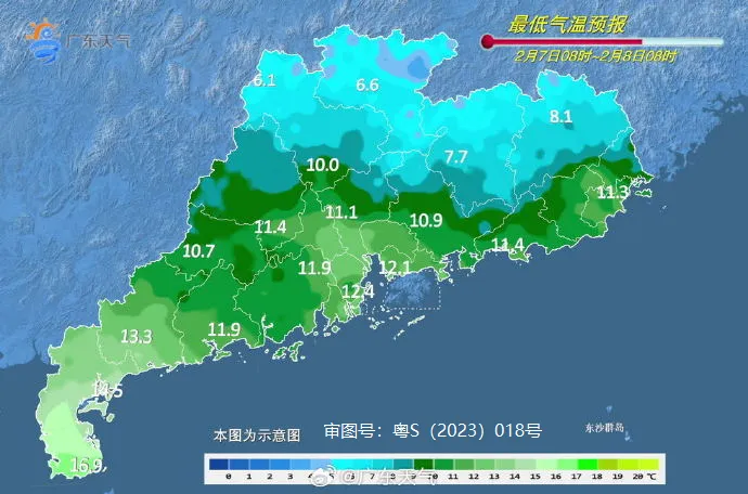 受中等强度冷空气影响,广东省2月7日大部分地区有弱降水,2月8日西部市县有分散小雨,2月9日粤北有小雨,未来三天全省气温持续下降,其中2月8日—9日早晨粤北部分市县有5℃以下低温,高海拔山区1℃—3℃,局部有霜(冰)冻。