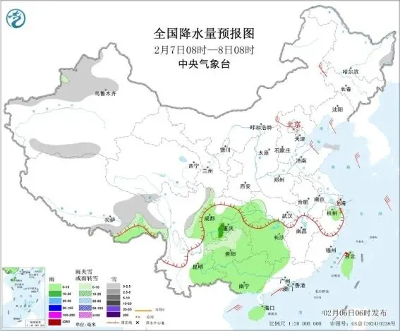 2月8日华南西部地区有小到中雨,贵州北部等地部分地区有小雪或雨夹雪。