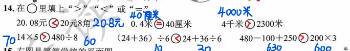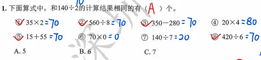 试卷全程贯穿“会用数学的眼光观察世界、用数学的思维思考世界”的素养目标,每道试题都兼顾基础与能力,拒绝偏题怪题。如选择题第1题,“找和140÷2计算结果相同的算式”,没有单纯考查计算结果,而是结合35×2、560÷8等不同运算形式,考查学生对运算规律的灵活运用,凸显运算能力素养;第6题考查16×4的三种计算方法,通过对比不同思路,引导学生理解算理,而非机械记忆算法,契合素养立意“重过程、轻结果”的要求。填空题第12题,将300-180=120、120÷4=30合并成综合算式,考查学生对混合运算顺序的理解与运用;解答题第22题计费方案选择,要求学生对比两种游玩方案的性价比,既考查计算能力,又培养数据分析和优化思维,让核心素养不再是抽象概念,而是可落地、可考查的具体能力。(二)情境真实接地气,做题如同过生活