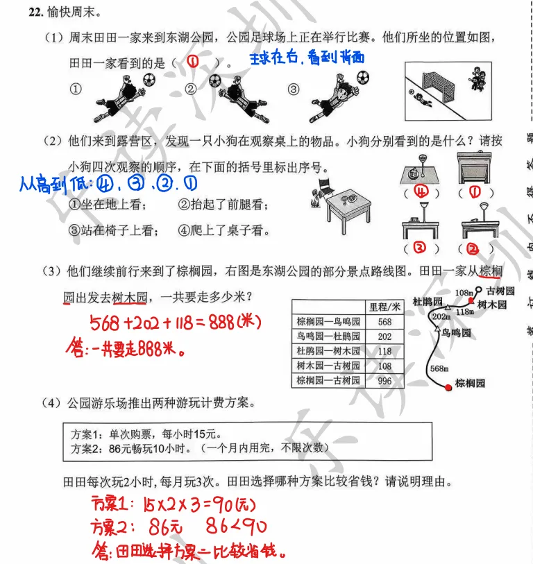 试卷彻底打破“情境虚假”的命题误区,所有试题情境都源于学生日常,生动有趣且贴合学情。如解答题第22题,以“田田一家游东湖公园”为线索,串联起观察物体(判断看到的比赛场景)、路线计算(棕榈园到树木园的里程)、计费方案选择等知识点,让学生在沉浸式情境中运用数学知识,避免“考数学变成考语文”的尴尬。此外,选择题第3题的午餐配菜搭配、第5题的拌面与烤肠价格问题,填空题第16题的科创节投票统计、第20题的全运会时间计算,购物题中的笔记本、订书机计费等,每道题都源于学生熟悉的生活场景,让学生真切感受到“数学源于生活、用于生活”。这种真实情境的设计,既激发了学生的答题兴趣,又考查了应用意识素养,完美契合素养立意“情境真实化”的特征。(三)梯度清晰重基础,兼顾差异促提升