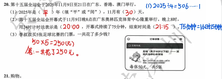 试卷遵循“基础为王、梯度推进”的原则,题型涵盖选择、填空、解答,层次分明,兼顾不同水平学生的发展。基础题占比适中,如填空题第11题的单位换算(深圳北站到广州南站的里程、1元硬币厚度)、第14题的大小比较,解答题第17题的脱式计算,都是三年级上册核心基础,确保基础薄弱的学生能获得成就感。提升题和难题注重思维拓展,且不偏不怪,如选择题第10题,结合阅读时长统计表判断田田的排名对应的时长,考查数据分析能力;解答题第22题第(4)问的计费方案,需要学生全面分析、合理对比,培养综合运用能力。这种梯度设计,既夯实基础,又能让学有余力的学生得到锻炼,实现“以考促优”,避开传统命题“重技巧、轻基础”的误区。二、教学建议:对接命题,精准发力,让素养培育落地课堂