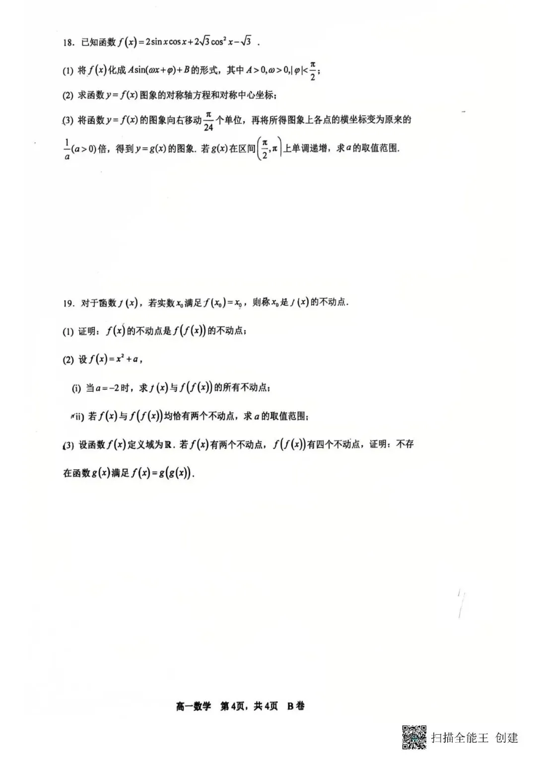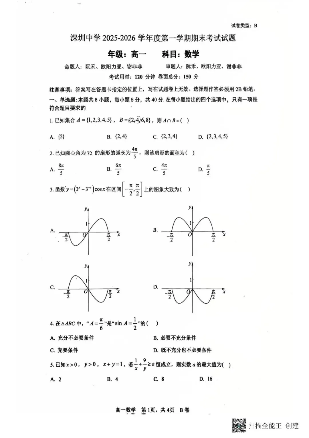 >广东深圳中学2025-2026学年度第一学期期末考试试题高一数学