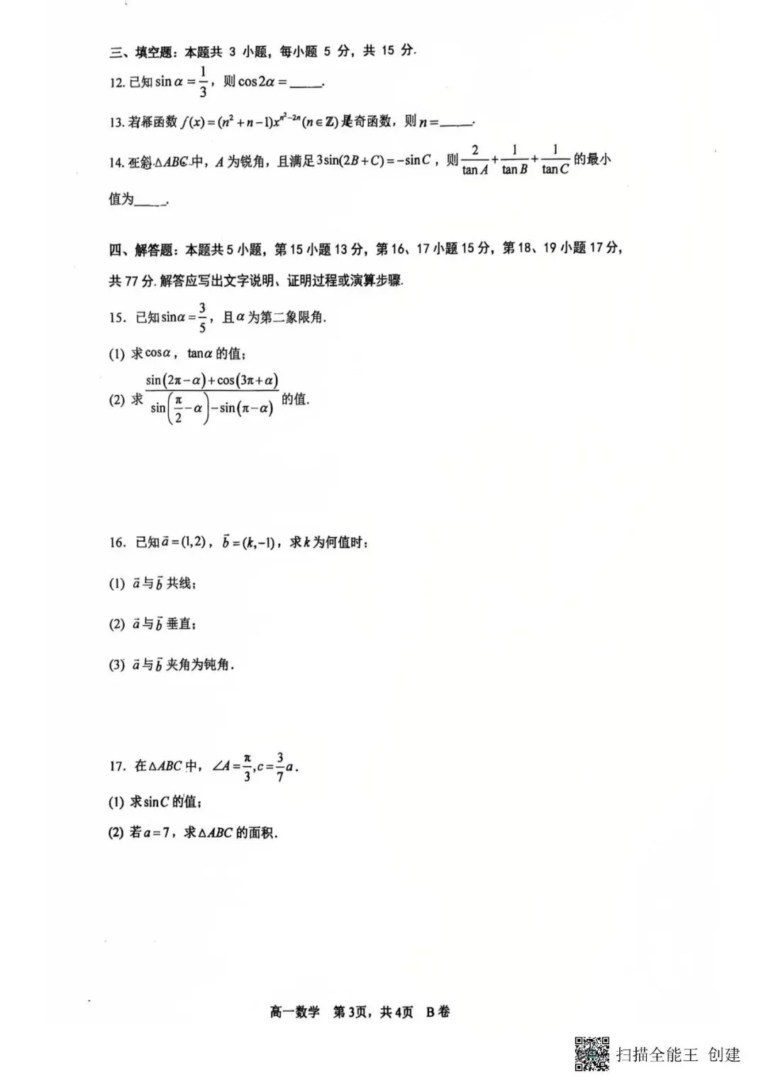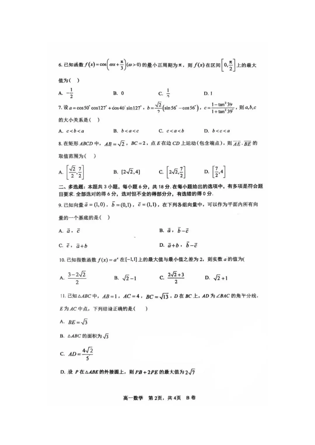 广东深圳中学2025-2026学年度第一学期期末考试试题高一数学