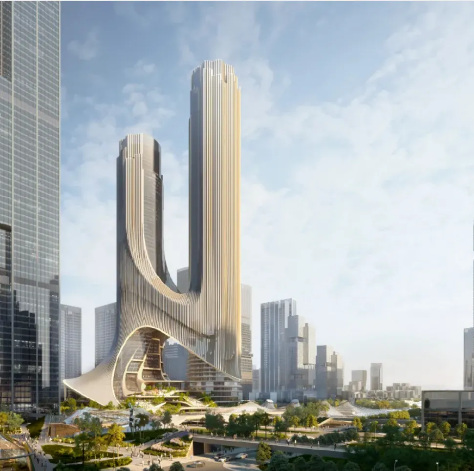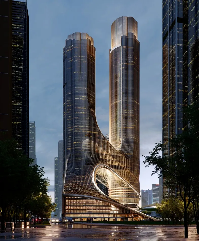 深圳湾超级总部C塔是扎哈·哈迪德建筑事务所的经典之作,其设计以极具未来感的流线造型和复杂精密的钢结构体系著称。建筑仿佛由数个扭转的体块交织攀升而成,外覆晶莹剔透的玻璃幕墙,在阳光下折射出动态的光影,宛如一组正在生长的晶体,展现了数字化设计与尖端建造技术结合的可能性。