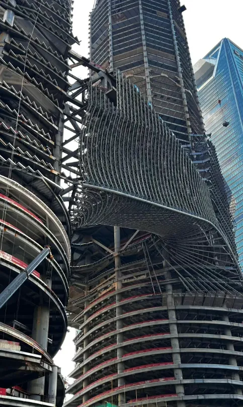 项目钢结构体量非常大,特别位于两塔楼相连位置的钢结构通过渐变式的扭转形成完美的衔接,灵动曲线交织而成的主体骨架,被一袭流畅的幕墙轻盈包裹,整体形态优雅如行云流水,其背后却是极为精密繁复的建造历程。