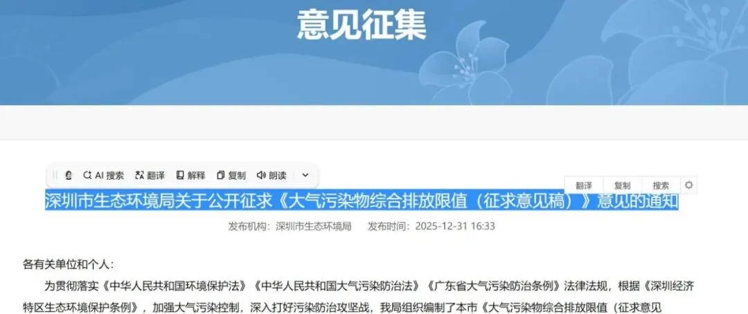 日前,深圳市就《大气污染物综合排放限值(征求意见稿)》公开征求意见,其中对非甲烷总烃等关键污染物的排放限值提出了堪称国内领先的严格标准。