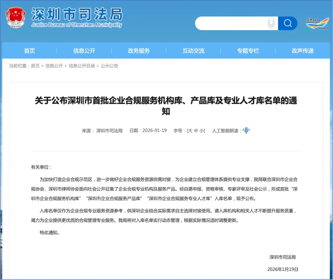 2026年1月19日,为加快打造企业合规示范区,进一步做好企业合规服务资源供需对接,为企业建立合规管理体系提供专业支撑,深圳市司法局联合市企业合规协会、市律师协会面向社会公开征集了企业合规专业机构及服务产品。