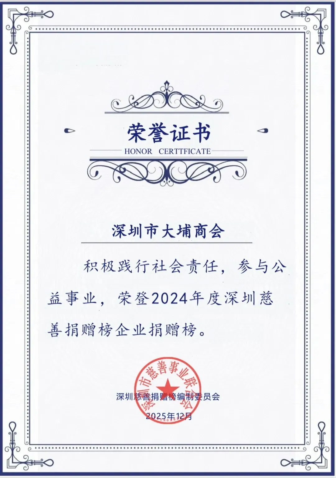 春回大地,捷报频传。在此,我们怀着无比喜悦与自豪的心情向全体会员和社会各界报喜:在深圳市民政局最新发布的《2024年度深圳慈善捐赠榜》中,深圳市大埔商会光荣上榜,荣获“企业捐赠榜”称号。这份沉甸甸的荣誉,不仅是对商会过去一年慈善义举的官方褒扬,更是全体埔商心系桑梓、乐善好施精神的集中体现,为深圳“慈善之城”的名片增添了光彩。