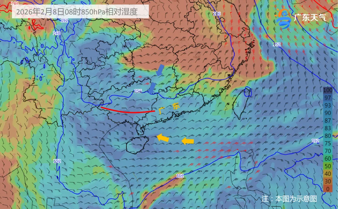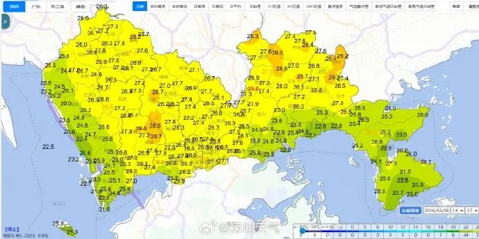 2月8日,西部市县多云到阴天,有分散小雨,其余市县多云。最低气温:粤北和珠三角北部市县4~10℃(高海拔山区1~3℃),粤西市县14~18℃,其余市县10~14℃。